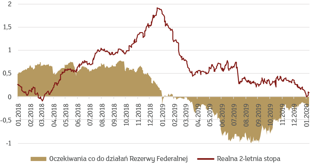 Wykres 2. Oczekiwania dla Rezerwy Federalnej i 2-letnie realne stopy procentowe w USA