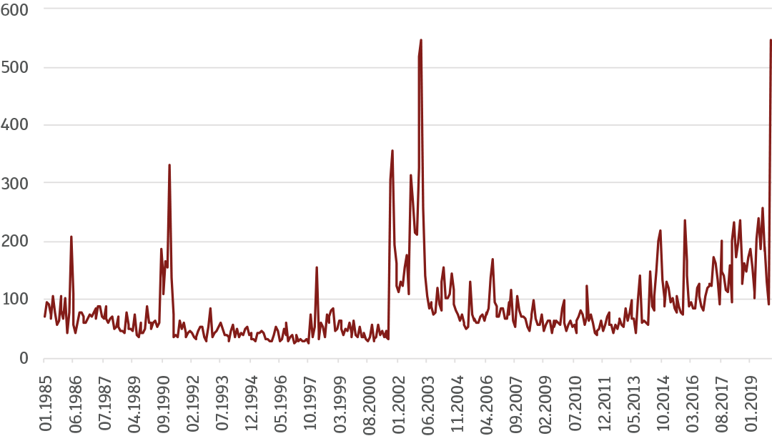 Początek 2020 roku dobitnie pokazał, jak nieprzewidywalna potrafi być sytuacja polityczna w wydaniu globalnym. Co prawda kryzys na Bliskim Wschodzie wydaje się być zażegnany, to jednak przez kilka dni większość inwestorów była wystawiona na ciężką próbę. Zresztą nie było to zupełnie nieuzasadnione. Wykres 3 pokazuje jeden z wielu dostępnych indeksów mierzących poziom ryzyka geopolitycznego.