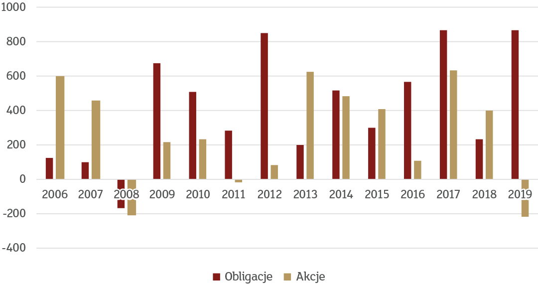 W minionym roku przywoływaliśmy już te dane, ponieważ były one zupełnie sprzeczne z intuicją. Intuicja sugerowałaby bowiem, że w roku kiedy indeks S&P500 rośnie o niemal 1/3, inwestorzy gremialnie ruszą na zakupy. Tymczasem, mieliśmy do czynienia z największym odpływem od 2008 roku, kiedy to wyniki rynku były zgoła odmienne. Co zatem kupowali inwestorzy? Otóż 2019 był rokiem jednego z największych napływów na rynek obligacji w historii.