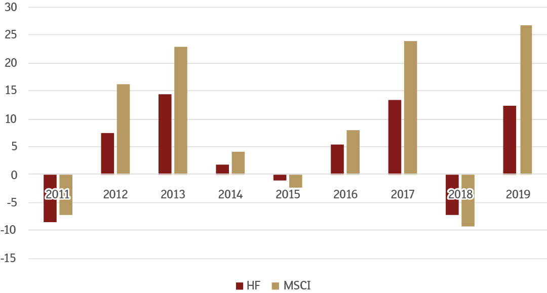 Spójrzmy też na nieco inną miarę zaangażowania inwestorów na przykładzie funduszy hedgingowych. Wykres 6 pokazuje roczne stopy zwrotu funduszy hedgingowych typu long/short1 w zestawieniu ze zmianą indeksu MSCI World.