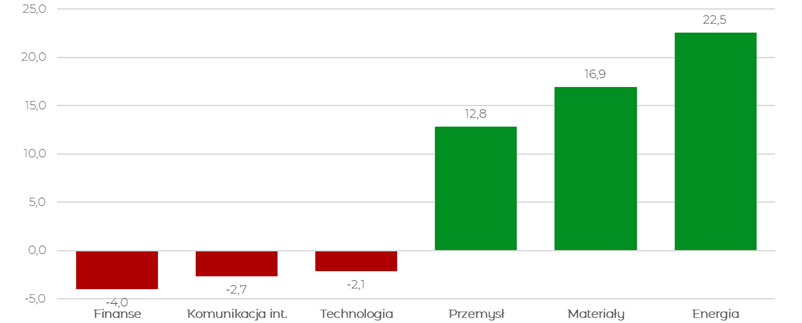 Sporo pesymizmu płynie od inwestorów przyzwyczajonych do trwania przy liderach wzrostu z kilku poprzednich lat. Tymczasem „przegrani” z 2025 roku stają się zwycięzcami obecnego roku. Od początku 2026 r. obserwujemy rotację od spółek typowo wzrostowych do sektorów z tzw. starej ekonomii. Tracą sektory takie jak technologie czy komunikacja internetowa oraz spółki takie jak Microsoft, Apple, Meta Platforms czy Palantir. Zyskują za to sektory m.in. wydobywczy, materiałów podstawowych czy energetyczny. Sektory z tzw. starej ekonomii, postrzegane są jako te, które mogą obronić się przez „zawirowaniami” związanymi z AI i zyskują najwięcej.