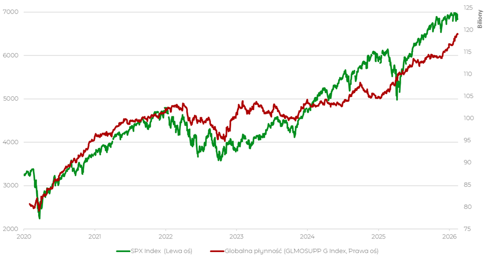 Daleko nam do kreślenia rynkowych scenariuszy na podstawie jednej zależności, ale bazując na powyższym wykresie możemy stwierdzić, że globalna płynność co najmniej nie przeszkadza w kontynuacji trendów.