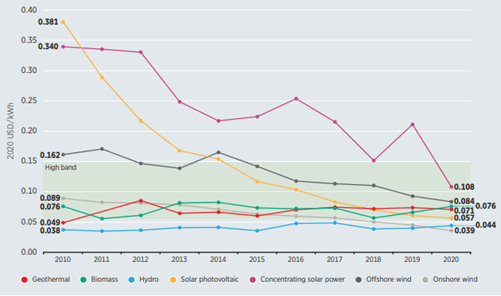 Globalny średni ważony koszt wytworzenia energii elektrycznej z głównych źródeł odnawialnych (poszczególne linie) jest obecnie porównywalny lub niższy niż ze źródeł kopalnych (zielony obszar na wykresie).