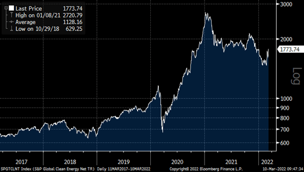 Co ciekawe sektor producentów czystej energii stracił od początku 2021 roku 25% (jako miarę koniunktury wykorzystujemy indeks S&P Global Clean Energy). Ta korekta miała miejsce po superhossie z lat 2019-2020 (+240%), kiedy kierunek ku energetyce odnawialnej stał się dla wielu inwestorów oczywisty. Wyznaczyły go decyzje polityczne i spadające koszty, w relacji do tradycyjnych źródeł energii.