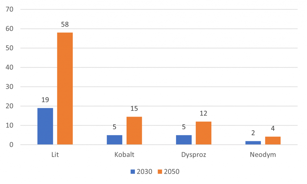 Transformacja energetyczna nie jest jednak funkcją wyłącznie woli politycznej i spadających kosztów odnawialnych vs. konwencjonalnych źródeł energii. Przeprowadzenie zielonej rewolucji wymaga przede wszystkim dostępu do grupy kluczowych surowców, a wzrost zapotrzebowania powinien być potężny. Wg szacunków Komisji Europejskiej europejski popyt na lit w związku z tylko i wyłącznie transformacją energetyczną może wzrosnąć do 2050 niemal 60-krotnie (oznacza to ponad 15% średnioroczny wzrost przez 3 dekady). Ale będziemy potrzebować również kilkunastokrotnie więcej dysprozu, czy kilkukrotnie więcej neodymu.