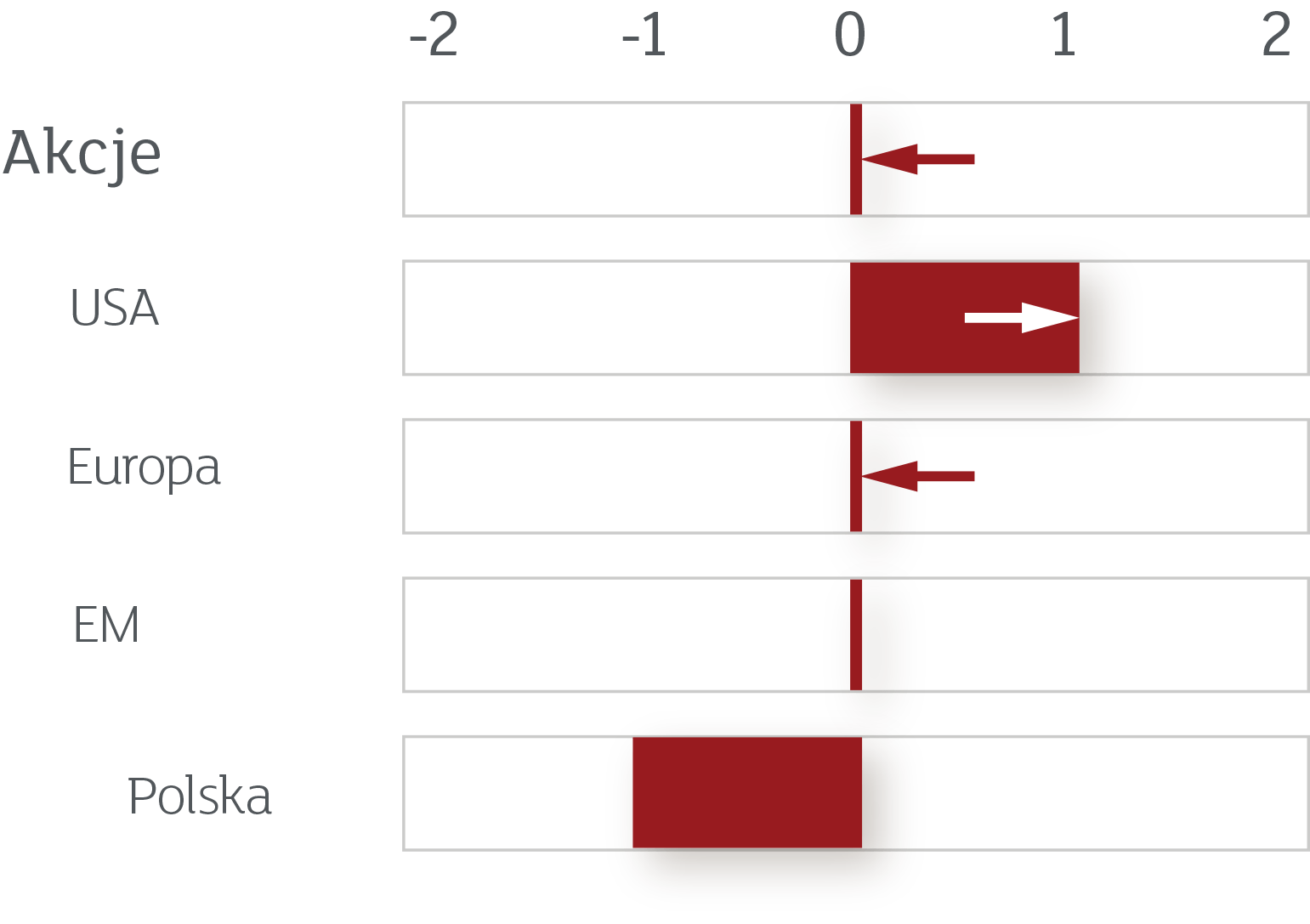 Kiedy przed wakacjami zwiększaliśmy alokację na rynek akcji, kluczowym argumentem było stosunkowo duże niedoważenie światowych inwestorów i swego rodzaju niewiara i sceptycyzm odnośnie kontynuacji wzrostów. Argumentowaliśmy, że duża część inwestorów nie będzie miała wyjścia i będzie zmuszona do zakupów. Tak też się stało. Ponieważ nasz scenariusz na lato w większości się zmaterializował, to wracamy do neutralnej alokacji na rynek akcji. Nie oznacza to bynajmniej, że nie wierzymy w dalsze wzrosty. Wszak działalność banków centralnych wraz z odbiciem gospodarczym powinna dalej wspierać rynki. Ale tak samo jak w marcu pisaliśmy o rebalansowaniu portfeli z części dłużnej na akcyjną, tak teraz widzimy spore prawdopodobieństwo, że część inwestorów wykona ruch odwrotny. Chcielibyśmy jednak podkreślić, że długoterminowe perspektywy w otoczeniu zerowych stóp procentowych w dalszym ciągu wspierają bardziej ryzykowne inwestycje. Poniżej przedstawiamy naszą aktualną preferowaną alokację aktywów: