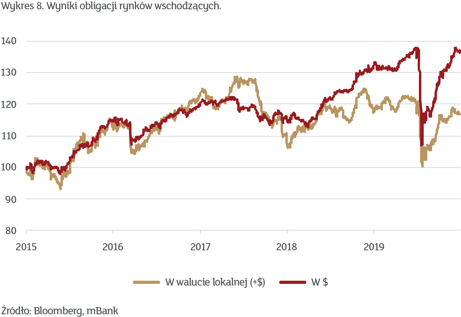 Wracamy również do przeważenia w obligacjach rynków wschodzących. Rentowność w tym segmencie jest również relatywnie atrakcyjna, a dodatkowo wydaje się, że inwestorzy zaczęli ostatnio oczekiwać osłabienia dolara. Historycznie był to bardzo dobry prognostyk dla obligacji rynków wschodzących, zwłaszcza w walucie lokalnej. Zresztą akurat ta część rynku ma jeszcze sporo do nadrobienia do poprzednich szczytów. Na wykresie 8 pokazujemy ją w zestawieniu z obligacjami rynków wschodzących emitowanymi w dolarach.