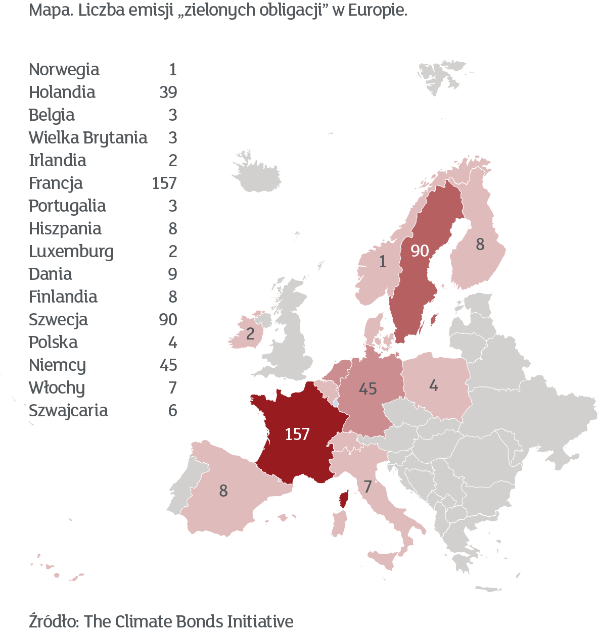 Ostatnią grupą obligacji, która naszym zdaniem będzie przykuwać uwagę inwestorów to tzw. zielone obligacje. Są to obligacje emitowane np. na potrzeby budowania farm wiatrowych czy wymianę pieców. Wielokrotnie przez nas wspominany wzrost zainteresowania inwestycjami ESG (Environmental, Social, Governance) sprawia, że inwestorzy chcą mieć w portfelach taki produkt. Coraz więcej emitentów się o tym przekonuje i mamy do czynienia z co raz to nowymi emisjami. Prym wiedzie Europa, a zwłaszcza Francja, Holandia i Niemcy, co pokazujemy na mapce poniżej. Warto też zauważyć, że w Polsce powoli zaczynają się pojawiać zielone obligacje, co powinno być ciekawym składnikiem portfeli dłużnych.