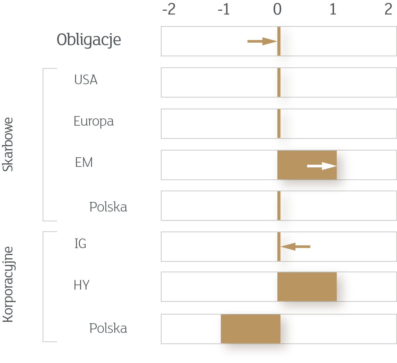 Obligacje korporacyjne przedsiębiorstw o wysokiej wiarygodności (czyli Investment Grade) oferują już bardzo niewiele. Owszem, jest to ciągle więcej niż skarbówki, ale niewiele więcej. Obligacje spółek typu High Yield z kolei wyglądają wciąż bardzo atrakcyjnie. Naturalnie są one obarczone większym ryzykiem, ale pamiętajmy, że banki centralne bardzo aktywnie wspierają również i ten segment rynku nie chcąc dopuścić do fali bankructw. Dlatego też w części korporacyjnej utrzymujemy przeważenie w segmencie HY.