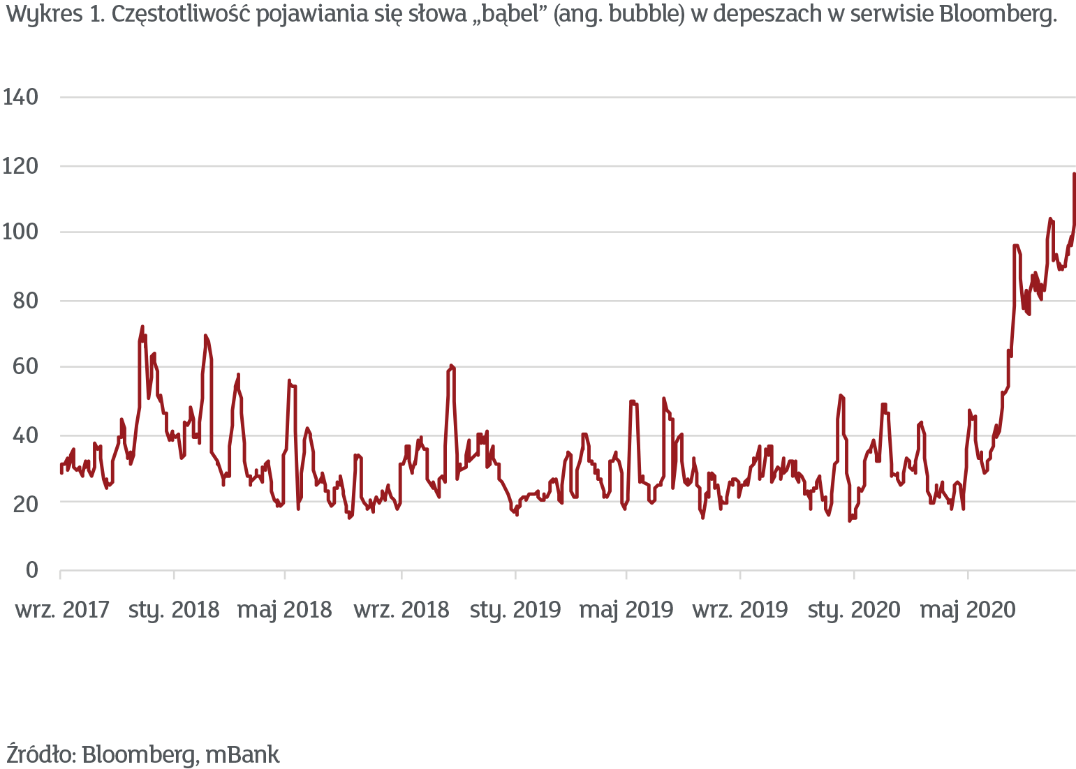 Nie jest już chyba dla nikogo zaskoczeniem, że spółki technologiczne to jeden z największych wygranych ostatniego kryzysu. Trudno przypuszczać, żeby osoby, które np. przyzwyczaiły się do robienia zakupów przez internet, po wynalezieniu szczepionki na koronawirusa, postanowiły wrócić do starych nawyków. Tymczasem co rusz pojawiają się w mediach doniesienia, jak to obecna sytuacja przypomina tę sprzed 20 lat. Na wykresie 1 poniżej pokazujemy średnią dzienną liczbę depesz z serwisu Bloomberg, w której pojawia się słowo „bubble”, czyli bańka spekulacyjna.