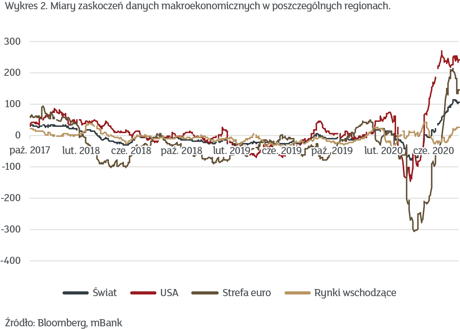 Zresztą ostatnie wzrosty to nie tylko funkcja zyskowności tej czy innej spółki. Notabene, wyniki technologicznych gigantów za II kwartał były wprost rewelacyjne i pobiły oczekiwania analityków. Podobną sytuację obserwowaliśmy w realnej gospodarce. Tzw. indeksy zaskoczeń mierzące, jak bardzo zaskakiwani są prognozujący osiągnęły w ostatnim czasie poziomy nie obserwowane od lat. Pokazujemy to na wykresie 2.