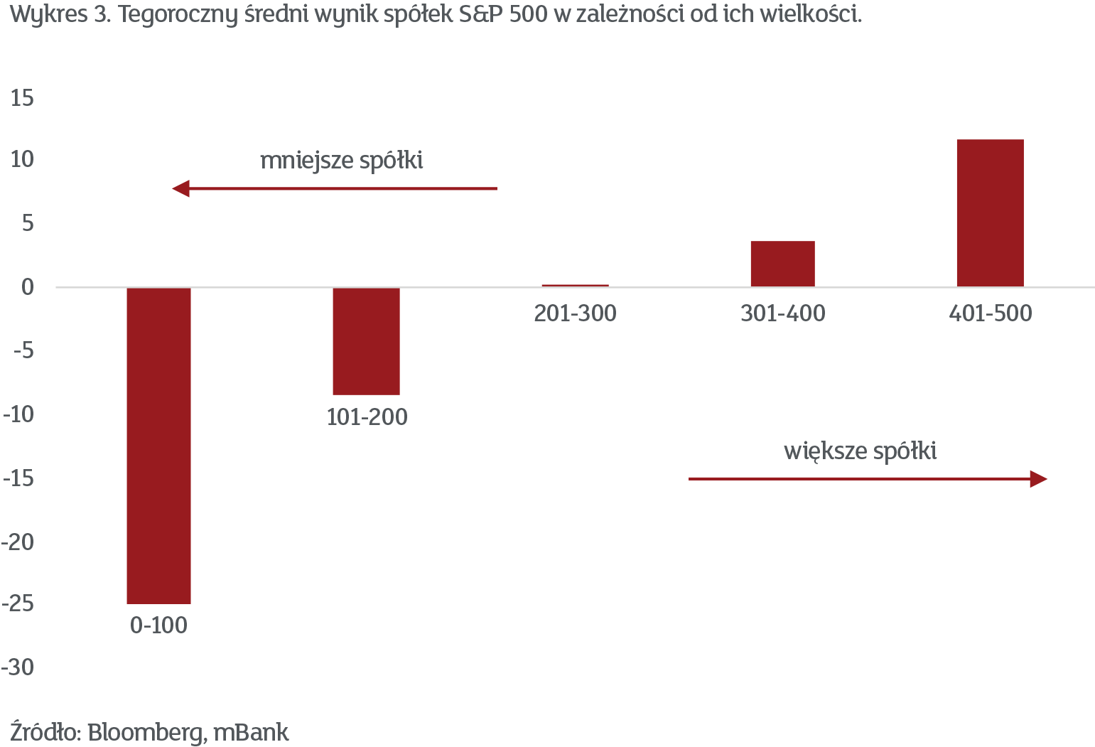 Ale wróćmy do naszej literki K. W momencie pisania tego tekstu, wynik S&P 500 za 2020 rok to około +7%. Na pierwszy rzut oka jest to świetny rezultat, ale skrywa on bardzo istotne szczegóły. Podzielmy sobie spółki z indeksu na 5 grup, według kapitalizacji i porównajmy ich stopy zwrotu. Wyniki przedstawiamy na wykresie 3.