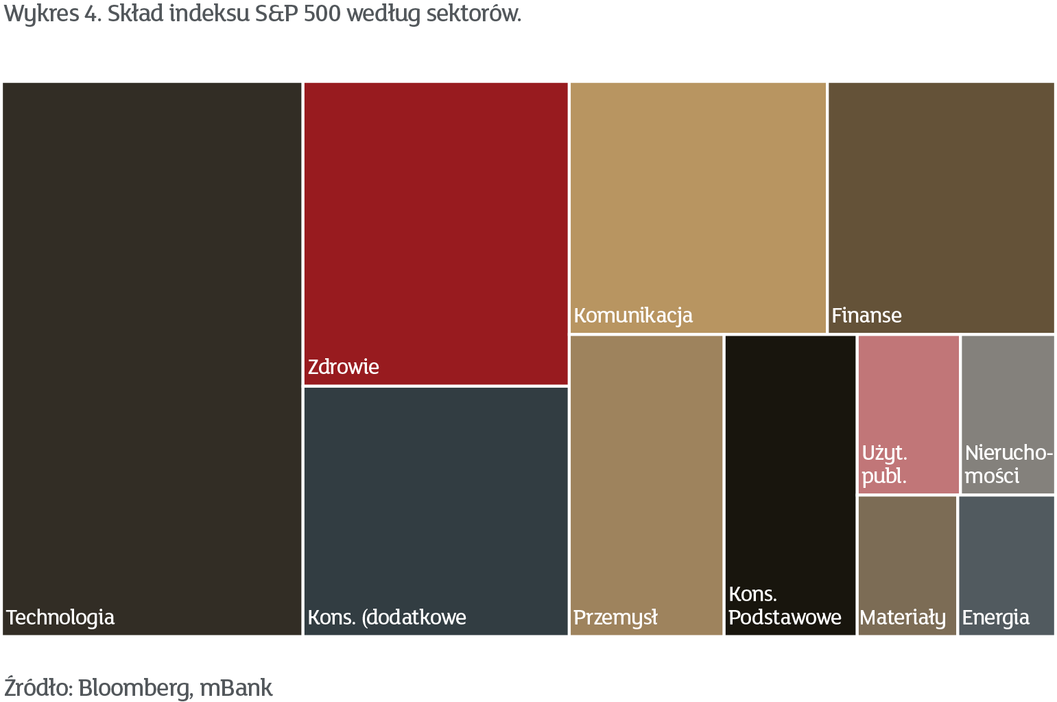 Jak widać najmniejsze 100 spółek (średnia kapitalizacja około 7,5 miliarda dolarów, czyli więcej niż PKN czy PZU, a porównywalnie z KGHM) skurczyło się w tym roku o niemal ¼. Z kolei największe 100 spółek (średnia kapitalizacja około 220 miliardów dolarów) wzrosło o ponad 10%. Prym oczywiście wiodły tu spółki z branży technologicznej ze słynnymi FAAMGami na czele (Facebook, Apple, Amazon, Microsoft oraz Google). Nic więc dziwnego, że sektor technologiczny to już około 30% indeksu S&P 500, co dobrze widać na wykresie 4.