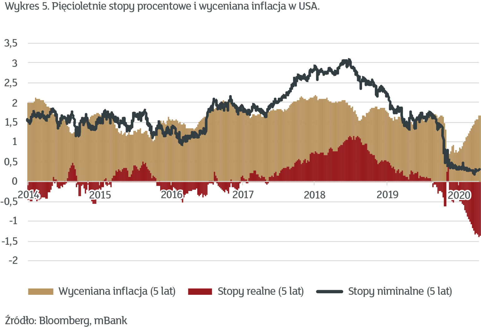 Najpierw spójrzmy, czego aktualnie spodziewają się rynki. Na wykresie 5 pokazujemy rentowności obligacji – nominalne i realne – a także wycenianą przez rynek inflację w kolejnych 5 latach.