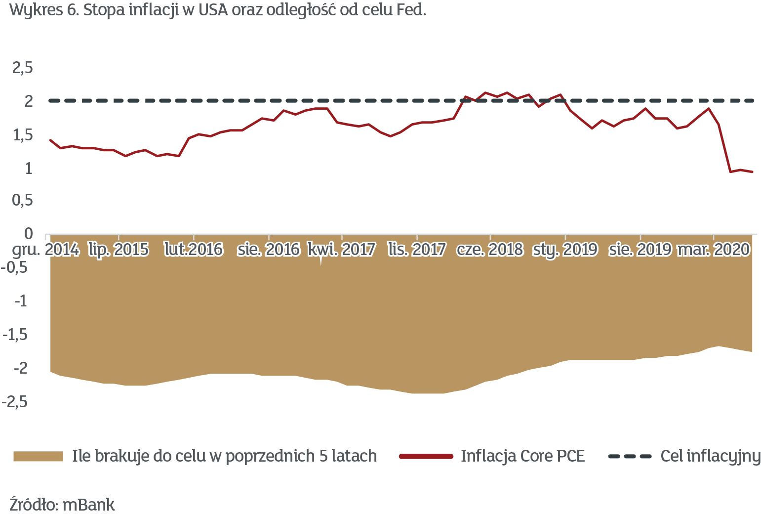 Fed powiedział, że ponieważ przez dłuższy czas inflacja znajdowała się poniżej celu, to będzie bardziej tolerancyjny, jeśli ta wzrośnie powyżej 2%. Brzmi to trochę jak trzymanie lewej ręki w lodowatej wodzie, a prawej we wrzątku i mówienie, że woda jest letnia, ale ma bardzo istotne implikacje. Obecnie preferowana przez Fed miara inflacji (Core PCE) to mniej niż 1% i minie wiele kwartałów zanim dojdzie z powrotem do 2%. Jeśli założyć, że Fed będzie bardziej tolerancyjny niż kiedyś i pozwoli przez jakiś czas na przestrzelenie celu, to mamy przed sobą długi okres stóp na poziomie zero. Jaki to okres? Pokuśmy się o kwantyfikację. Wykres 6 pokazuje, ile wynosi inflacja w USA i o ile w sumie oddaliła się od celu 2-procentowego w ostatnich 5 latach.