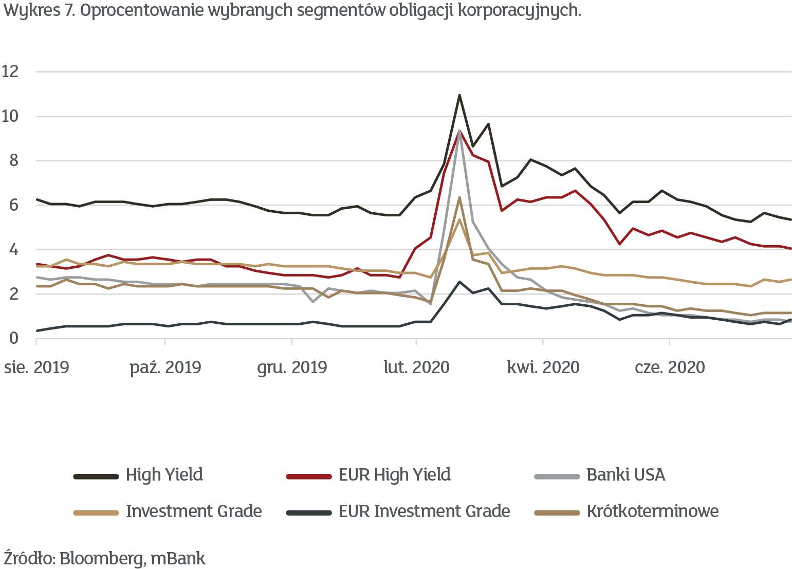 Konsekwencją zmniejszenia zaangażowania na rynek akcji w naszej modelowej alokacji jest zwiększenie udziału obligacji. Niestety, najbezpieczniejsze obligacje skarbowe obecnie nie gwarantują wysokich stóp zwrotu, a w mijających kilku tygodniach nawet dostarczyły zauważalnych strat. Dlatego inwestorzy wypychani są w stronę bardziej ryzykownego długu korporacyjnego. Wykres 7 pokazuje aktualne rentowności wybranych segmentów obligacji korporacyjnych.