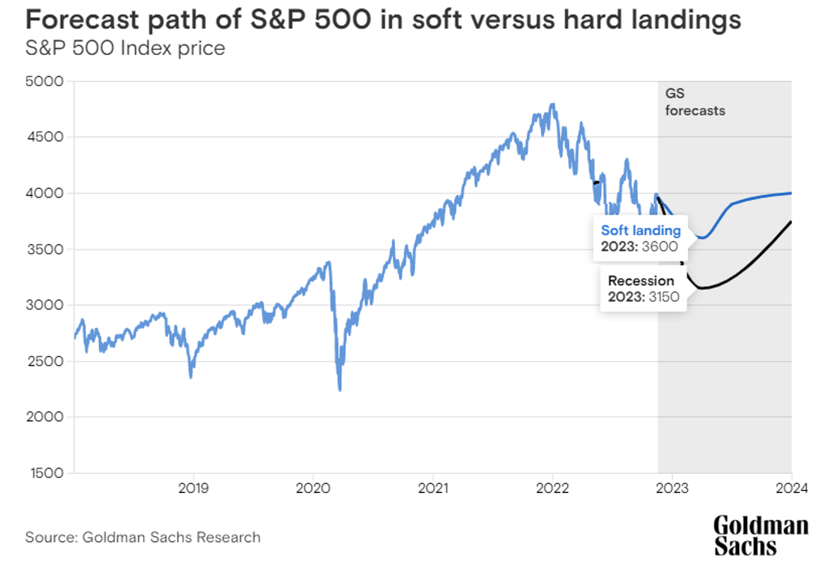 Jak widzimy, poziom 4 000 pkt został wyznaczony jako średnia ważona aż sześciu modeli, których poszczególne wyniki też były dosyć rozbieżne! Podobnie wygląda sytuacja w raporcie od Goldman Sachs Research.