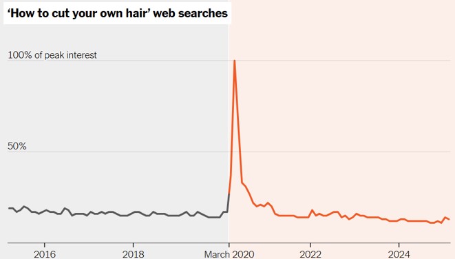 Źródło: Wyszukiwania w sieci dotyczące tego „jak samodzielnie obciąć sobie włosy”. https://www.nytimes.com/interactive/2025/03/09/upshot/covid-lockdown-five-year-charts.html