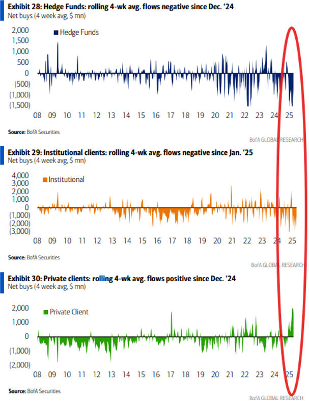 Co ciekawe przecena na amerykańskim rynku akcji z ostatnich tygodni pokazała całkowicie odwroty obraz rynku. To inwestorzy instytucjonalni spanikowali i uciekli z akcji, a inwestorzy indywidualni gremialnie je skupowali wraz z postępującymi spadkami. Dobrze ilustrują to dane Bank of America (od góry zakupy akcji przez fundusze hedgingowe, pośrodku inwestorzy instytucjonalni, na dole klienci indywidualni. Słupek w górę oznacza napływy netto, słupek w dół to odpływy):