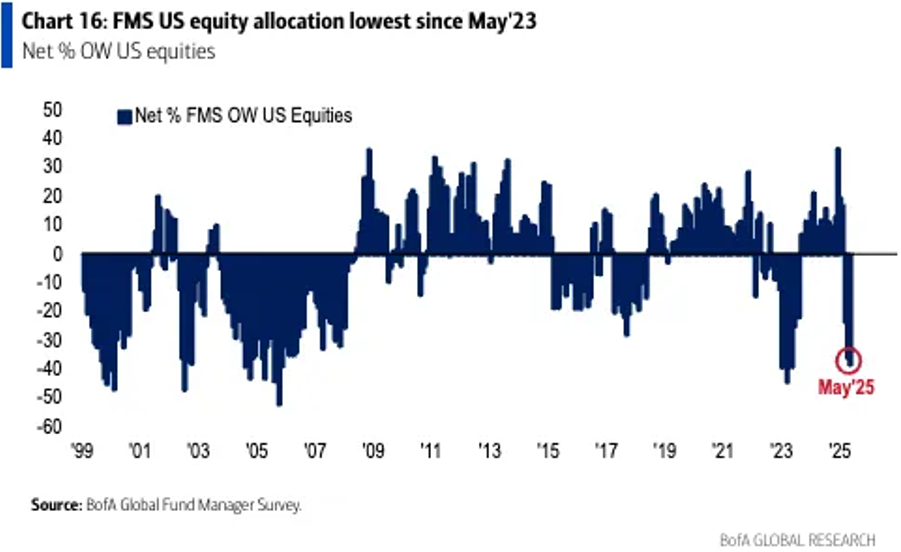 W parze z jednymi z największych odpływów inwestorów profesjonalnych idzie ich skrajnie negatywne nastawienie do amerykańskiego rynku akcji. Poniżej odpowiedź na pytanie, czy planujesz doważać, czy niedoważać amerykański rynek akcji – netto ok 40% inwestorów uważa, że należy niedoważać.