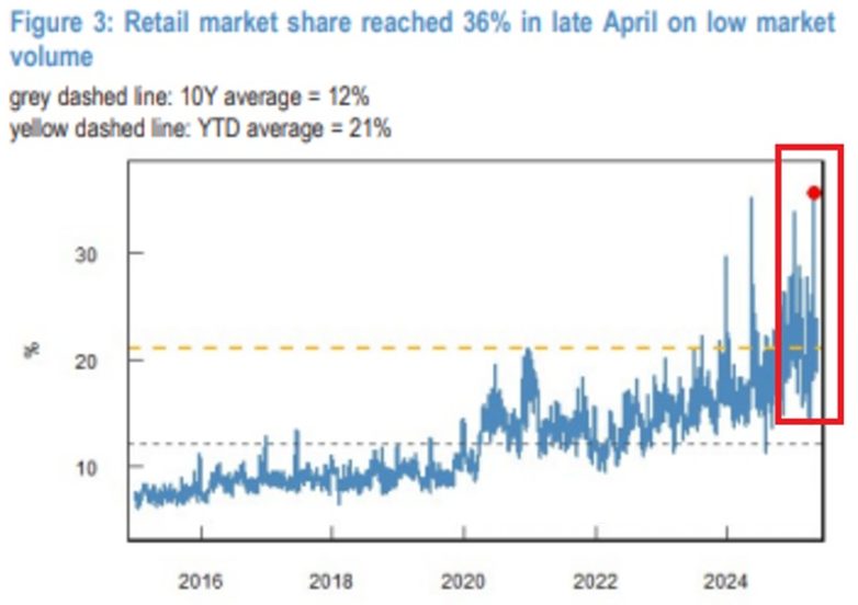 Odwrotnego zdania zdają się być inwestorzy indywidualni, którzy prawdopodobnie zachęceni dynamicznym odbiciem po ostatnim dołku wykorzystują każdą nawet najmniejszą korektę do dalszych zakupów. W poniedziałek 19 maja, po tym, jak agencja Moody’s obniżyła rating kredytowy USA, indeks S&P500 rozpoczął notowania ponad 1% pod kreską. Po niespełna 4 godzinach handlu inwestorzy indywidualni zakupili akcje o wartości 4 mld USD – najwięcej w historii śledzonej przez bank J. P. Morgan…