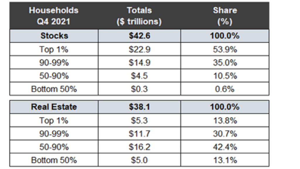 Wydaje się jednak, że przecena na rynku akcji uderzy po kieszeniach przede wszystkim najbogatszych Amerykanów, a nie tych o mniejszych majątkach i zarazem, którzy w największym stopniu kreują popyt w gospodarce. Jak widać w poniższej tabeli 10% najbogatszych gospodarstw domowych posiada prawie 90% akcji z amerykańskiego rynku (top1% posiada ponad 50% akcji!), natomiast pozostałe 90% procent społeczeństwa posiada zaledwie ok. 10% akcji (na marginesie, jest to też jeden z głównych powodów rosnącego rozwarstwienia społecznego). Sytuacja wygląda zupełnie inaczej w kontekście rynku nieruchomości. Tutaj top 10% najbogatszych Amerykanów odpowiada za ok. 45% rynku, a pozostałe 90% za 55%.