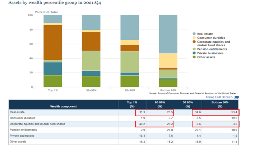 Na początku kwietnia Bill Dudley, czyli były członek Federalnego Komitetu ds. Otwartego rynku i jednocześnie były szef oddziału Fed w Nowym Jorku wystraszył inwestorów mówiąc, że w celu zduszenia inflacji, Fed będzie musiał wywołać spadki na rynku akcji (wypowiedzi można posłuchać tutaj). Chodziło mu o sprowokowanie tzw. efektu majątkowego, czyli w skrócie: aby Amerykanie mniej wydawali, muszą poczuć się biedniejsi (mniejsze wydatki to z kolei perspektywa niższej inflacji). W rozumowaniu Dudleya było jednak jedno niekoniecznie trafne założenie, że ogół społeczeństwa posiada znaczną część swojego majątku ulokowaną w akcjach, więc to właśnie „kanałem giełdowym” najlepiej jest wpływać na poczucie zamożności Amerykanów.