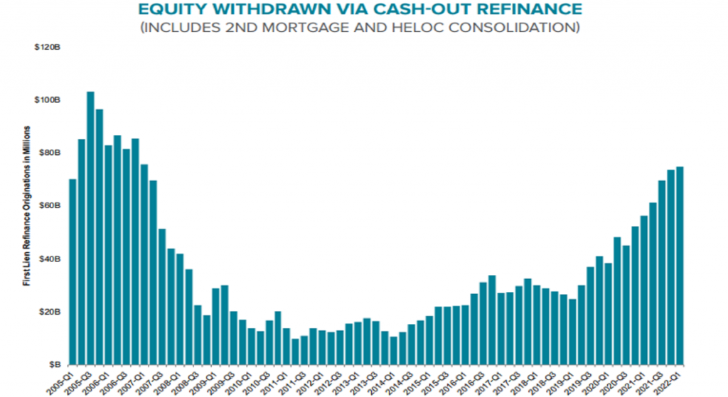 Wykres poniżej przedstawia wartość dodatkowej gotówki uzyskanej z refinansowania pierwszego kredytu hipotecznego, czyli tzw. Cash-out refinancing (np. jeżeli mamy kredyt na 200 tys. USD, a aktualnie oszacowana cena nieruchomości to 300 000 USD, możemy wziąć kredyt na tę kwotę, spłacić 200 tys. z pierwszego kredytu, a 100 tys. zatrzymać na inne wydatki). W wykresie uwzględniono również tzw. HELOC (Home Equity Line Of Credit), czyli w uproszczeniu linia kredytowa na wysokość różnicy w wartości nieruchomości a wartości posiadanego kredytu hipotecznego (100 tyś. dla powyższego przykładu).