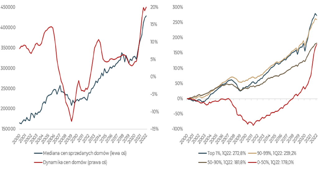 Podsumowując, jeżeli jednym ze sposobów walki z inflacją jest obniżenie wydatków konsumpcyjnych poprzez tzw. efekt majątkowy (czuje się biedniejszy, to mniej kupuje), to wydaje się, że sugestia Dudleya o konieczności obniżenia cen akcji, to nie jedyny i raczej nie najważniejszy czynnik. Drugi, być może istotniejszy, to ceny nieruchomości, które wpływają na największą częścią majątku zdecydowanej większości Amerykanów. Pogorszenie koniunktury na rynku nieruchomości prawdopodobnie już trwa, dlatego niewykluczone, że niebawem coraz silniej zacznie to odczuwać amerykański konsument, co przełoży się na niższy popyt konsumpcyjny i ostatecznie spowolnienie inflacji.