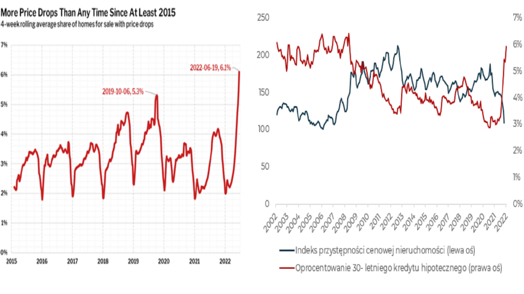 Jednak wydaje się, że trend wzrostu cen nieruchomości zmierza do rychłego końca. A to dlatego, że wraz z podwyżkami stóp procentowych przez Fed, kredyty hipoteczne stają się coraz droższe, więc popyt na nie powinien spaść, podobnie jak na nowe domy. Aktualnie oprocentowanie 30- letniego kredytu hipotecznego w USA sięga prawie 6%, co winduje koszty finansowania i sprawia, że nieruchomości stają się coraz mniej przystępne dla przeciętnego Amerykanina. Zresztą dane z rynku nieruchomości już wskazują, że aby sprzedać dom, coraz częściej cena musi zostać obniżona.