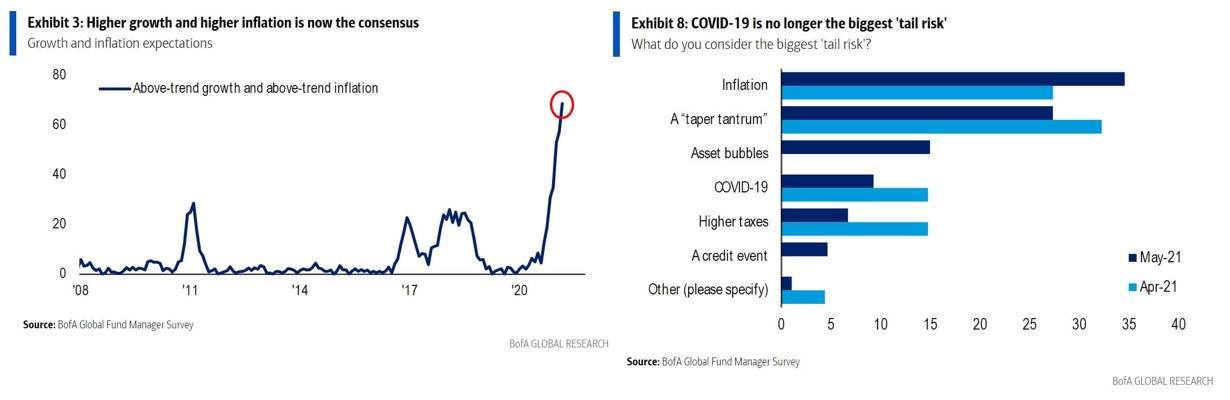 Wykres po prawej stronie pokazuje z kolei jakie są największe obawy inwestorów (dla porównania są też wyniki za kwiecień – Apr-21). Jak widać inflacja jest zdecydowanie na pierwszym miejscu, a zaraz za nią plasują się potencjalne kłopoty z rynkiem obligacji. Taper tantrum to określenie wielkiej wyprzedaży na rynku długu, która nastąpiła niemal dokładnie 8 lat temu po nieco niefortunnych wypowiedziach ówczesnego szefa Rezerwy Federalnej Bena Bernanke o zwijaniu programu luzowania ilościowego. Zwróćmy uwagę, że obawy o bańki spekulacyjne (asset bubbles), COVID-19, czy podatki (higher taxes) zeszły na zdecydowanie dalszy plan.