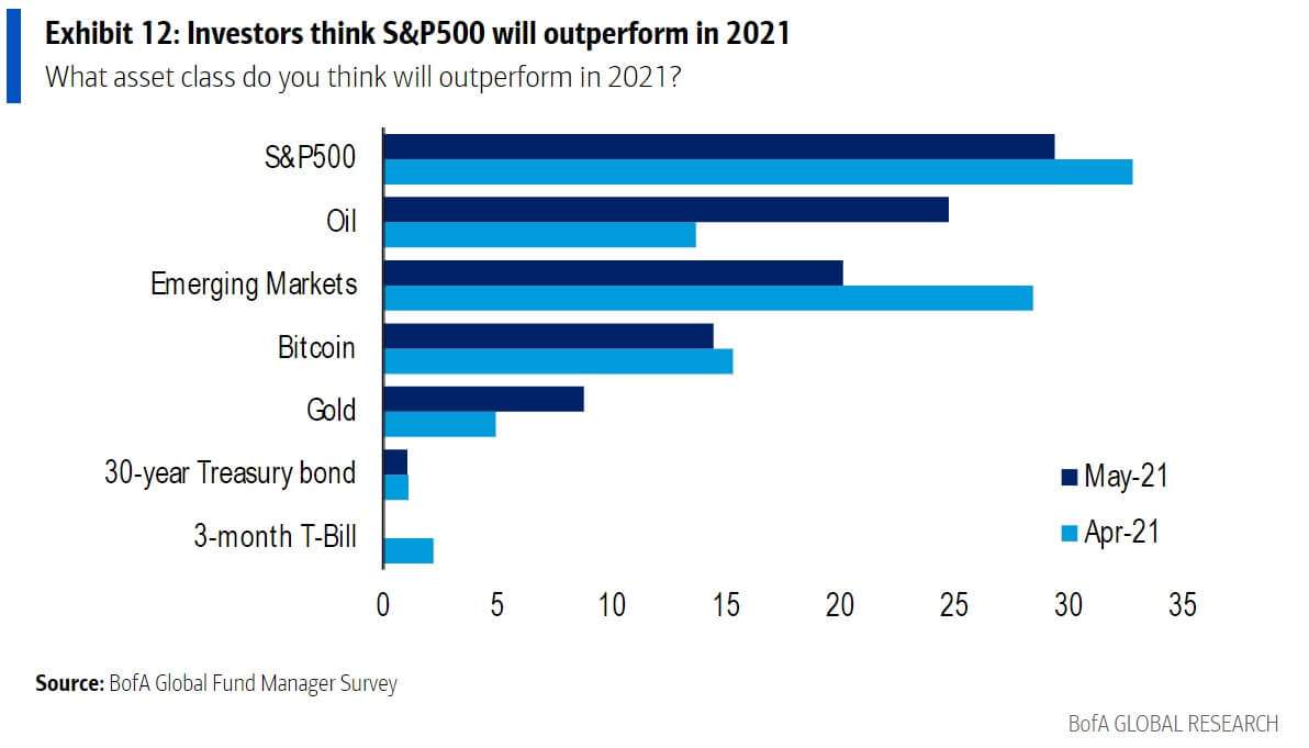 Niezmiennie na pierwszym miejscu znajduje się amerykański indeks akcji S&P500. Odsetek inwestorów, którzy na niego wskazują co prawda nieco się obniżył, ale nie na tyle, żeby spaść z pierwszego miejsca. Srebrny medal w tym miesiącu zdobyła ropa, co obrazuje ogólnie pozytywne nastawienie do rynku surowców. Podium zamykają rynki wschodzące, które historycznie były przecież dość dobrze skorelowane z cenami surowców. W czasie zbierania odpowiedzi ceny kryptowalut były o wiele wyższe niż teraz, więc Bitcoin ciągle znajduje się na liście. Zwracamy uwagę, że zaledwie kilka procent inwestorów obstawia amerykańskie obligacje skarbowe (30-year Treasury bond).