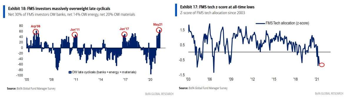 Wykres po lewej pokazuje jak wielu inwestorów przeważa w swoich portfelach banki, energetykę i spółki surowcowe (czyli właśnie sektory cykliczne). W wieloletniej historii badania nie widzieliśmy jeszcze aż takiego przeważenia. Z kolei wykres po prawej to alokacja na spółki technologiczne, która osiągnęła minima z okolic 2008/09. Wygląda zatem na to, że rotacja ze spółek wzrostowych (growth) do nisko wycenianych (value) jest już w bardzo zaawansowanym stadium. Nie oznacza to naturalnie, że nie może posunąć się dalej, ale przestrzegalibyśmy przed zbyt agresywną pogonią za tym trendem. Owszem, wspomniane przez nas przesunięcie w stronę Europy odzwierciedla tę tendencję, ale przypominamy, że już wielokrotnie Nasdaq i spółki technologiczne były przez inwestorów skreślane tylko po to, żeby później odrodzić się i osiągnąć nowe szczyty. W czasach tak dużych wychyleń poglądów, najlepszą obroną jest w dalszym ciągu dywersyfikacja portfela.