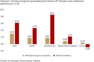 Wielokrotnie pisywaliśmy, że wyniki rynków akcji niekoniecznie muszą być spójne z kierunkiem, w którym zmierzają dane makroekonomiczne. „Giełda to nie gospodarka” – powtarzaliśmy niemal do znudzenia. Rzeczywiście, w minionym dziesięcioleciu, amerykański rynek akcji notował najgorsze wyniki w okresach najwyższych wzrostów PKB. Ale od każdej reguły są wyjątki, zwłaszcza gdy banki centralne diametralnie zmieniają swoje zachowanie, zwiększając tolerancję na szybszy wzrost cen, czyli inflację. I kwartał stał pod znakiem ostrych rewizji w górę prognoz wzrostu gospodarczego w najważniejszych gospodarkach świata. Zmiany, na przykładzie prognoz banku JP Morgan, przedstawiamy wraz z odpowiadającymi im zwrotami z indeksów giełdowych na wykresie 1.