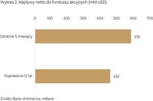 Jak widać, rynki rozwinięte doświadczyły bardzo dużej rewizji prognoz w górę, co skrzętnie wykorzystali inwestorzy alokując tam więcej środków. Ile? Według Bank of America w ostatnich pięciu miesiącach do funduszy akcyjnych napłynęło niemal 600 mld USD. To o ponad 100 mld USD więcej niż w sumie w poprzednich dwunastu latach! Pokazujemy to na wykresie 2.