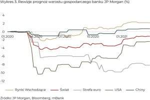 Spójrzmy jednak na rewizje prognoz wzrostu gospodarczego z nieco szerszej perspektywy. Na wykresie 3 pokazujemy jak JP Morgan zmieniał swoje prognozy od początku 2020 roku, czyli zaraz przed wybuchem pandemii.
