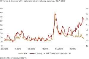 Kluczowe pytanie na najbliższe tygodnie i miesiące dla inwestorów giełdowych dotyczy natomiast zmienności. Jak pamiętamy, I kwartał był pełen fajerwerków – wyprzedaż na rynku długu, szaleństwo związane z tzw. akcjami memicznymi (meme stocks), problemy dużych funduszy hedgingowych, czy wreszcie utknięcie kontenerowca w Kanale Sueskim. Ostatecznie nie zmieniło to pozytywnego obrazu dla giełd, ale zmienność utrzymywała się na relatywnie wysokim poziomie. Ostatnio jednak rynek zaczyna spodziewać się nudy… Indeks VIX, zwany czasem indeksem strachu, spadł ostatnio poniżej 20. Co prawda jest to ciągle więcej niż średnia sprzed wybuchu pandemii (około 15) oraz wyżej niż historyczne minimum 9,14 osiągnięte w listopadzie 2017 roku, ale już średnia za 2020 rok wyniosła niemal 30, więc postęp jest widoczny. Co ciekawe, mimo że przyzwyczailiśmy się do tego, że wysoka zmienność to wysokie obroty, a niska zmienność to niskie obroty na giełdzie, ostatnie miesiące pokazują coś innego. Na wykresie 4 przedstawiamy indeks VIX zestawiony z dziennymi obrotami na indeksie S&P500.