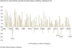 O ile inwestorzy na światowych rynkach akcji mogą ten rok jak na razie zaliczyć to udanych (po raz kolejny wyjątkiem jest tu nasz rodzimy WIG20…), o tyle na rynku długu było o wiele gorzej. Rok rozpoczęliśmy ze średnim oprocentowaniem światowych obligacji skarbowych na poziomie około 0,8%. Były to historycznie niskie poziomy, które na domiar złego nie dawały dużego marginesu bezpieczeństwa. Rewizje prognoz gospodarczych w górę, nawet mimo uporczywie (i słusznie!) luźnego nastawienia banków centralnych dość szybko przełożyły się na wyceny obligacji. Obecnie rentowność długu wynosi około 1,1%, czyli zaledwie 0,3 punktu procentowego więcej niż kilka miesięcy temu, ale to wystarczyło, żeby wywołać dość ostre spadki. Wykres 5 poniżej pokazuje kwartalne wyniki światowego indeksu obligacji od lat 90-tych ubiegłego wieku.