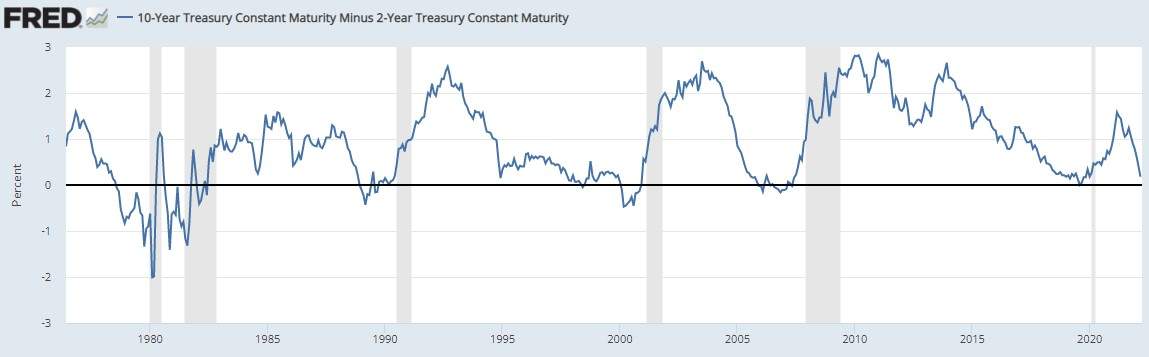 Zacznijmy najpierw od wyjaśnienia czym jest odwrócona krzywa rentowności. Normalna krzywa rentowności, występująca przez większość czasu to sytuacja, w której krótkoterminowe obligacje mają niższe rentowności niż długoterminowe. Inwestorzy wymagają wyższej dochodowości na obligacjach o dłuższym terminie zapadalności, które wiążą się z większym ryzykiem i wrażliwością na zmiany stóp procentowych. Zazwyczaj by określić nachylenie krzywej, od rentowności 10-letnich obligacji odejmujemy rentowności 2-letnich obligacji skarbowych i w związku z tym przeważnie wyliczony w ten sposób wskaźnik przyjmuje wartości dodatnie. Jednak nie zawsze. Są rzadkie momenty (co widać na poniższym wykresie), gdy różnica między rentownościami 10-latek i 2 latek jest ujemna. Wówczas właśnie mówimy o odwróconej krzywej rentowności. Jeżeli dodatkowo podpowiemy, że szare pola na wykresie oznaczają okresy recesji w amerykańskiej gospodarce, zaczyna być jasne skąd bierze się fenomen odwróconej krzywej rentowności.