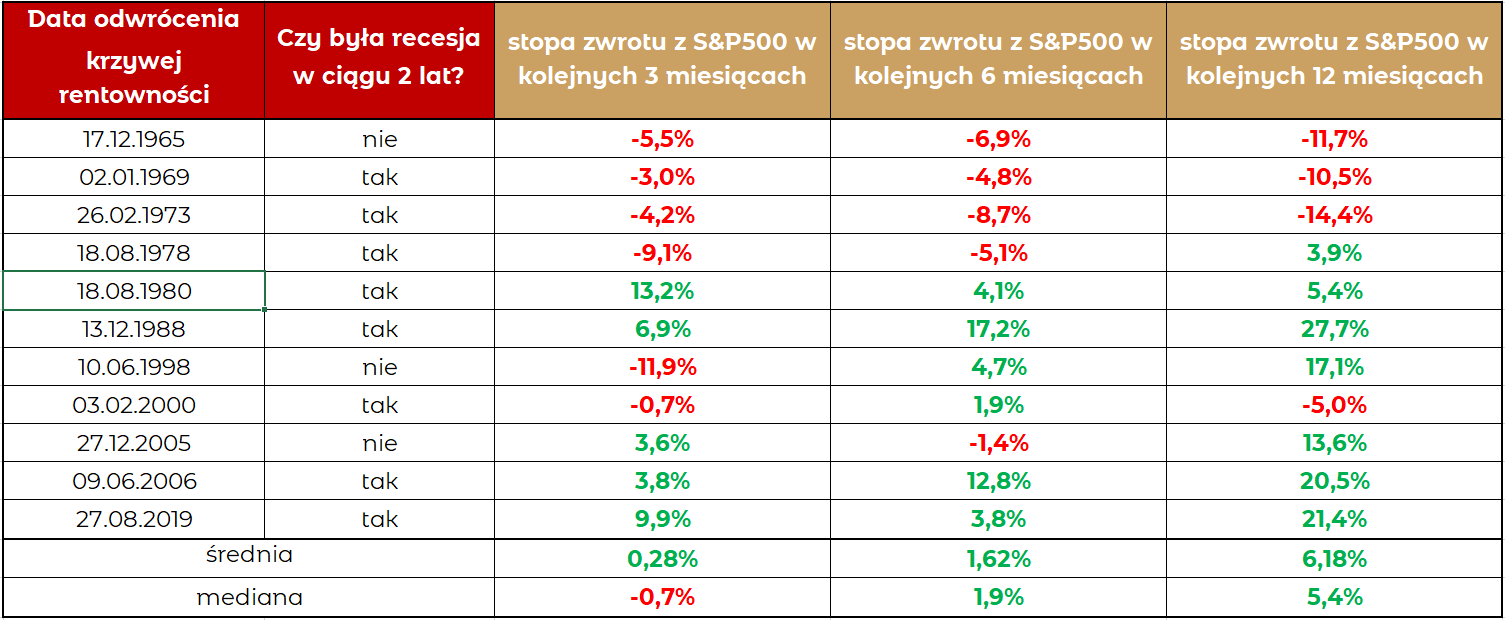 Na pierwszy rzut oka rzeczywiście może się wydawać, że wskaźnik ten dość dobrze prognozował nadchodzącą recesję. Historia (kolumna nr 2 w tabeli poniżej) wskazuje, że jednak nie zawsze odwrócenie się krzywej rentowności oznaczało recesję w kolejnych 2 latach. Dodatkowo, jeżeli już recesja się pojawiała to czasami po 10 miesiącach (przypadek z września 1980 r.) a czasami dopiero po 19 miesiącach (licząc od grudnia 1988 r.). Ciekawym przypadkiem był sierpień 2019r kiedy to pojawił się sygnał nadchodzącej recesji i rzeczywiście nastąpiła ona w kolejnym roku, ale powodem była… pandemia koronawirusa i nachylenie krzywej nie miało tutaj żadnego znaczenia.
