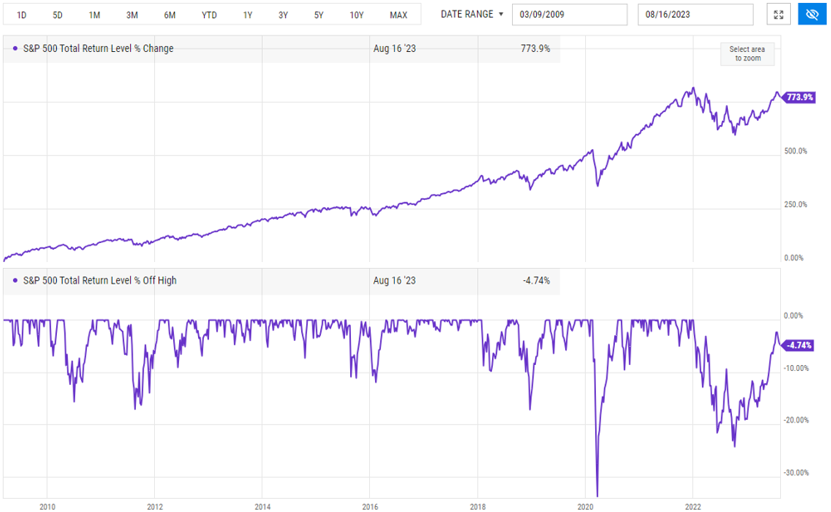 Stopa zwrotu z indeksu S&P500 Total Return (górny panel) oraz jego korekty (dolny panel) od dołka z 2009 r.