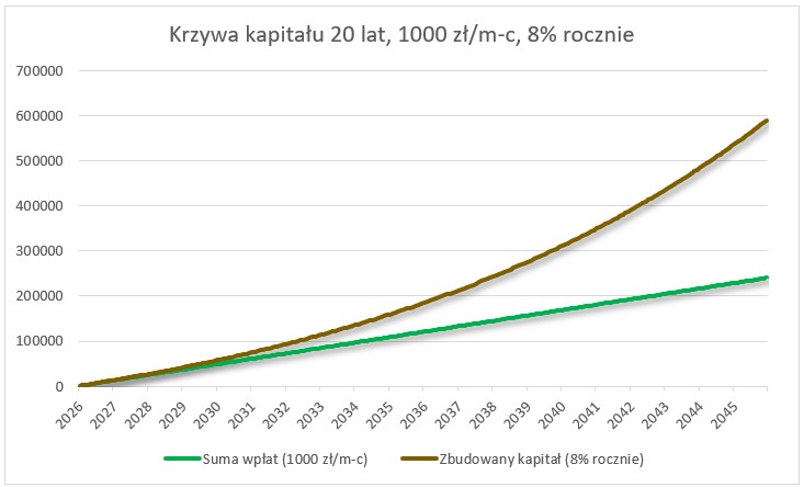 A tak zazwyczaj prezentowana jest krzywa kapitału, kiedy systematycznie odkładamy pieniądze przez kilkadziesiąt lat i inwestujemy je na rynku akcji.