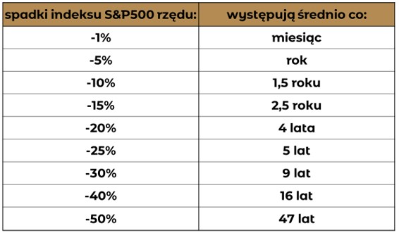 Spadki rzędu 10% będą zdarzały się przeciętnie raz na 1,5 roku, a średnio raz na 9 lat nasz portfel przeceni się o min. 30%. Dodatkowo matematyka w Excelu wygląda gładko, ale prawda o rynku akcji jest inna – on niemal nigdy nie pozwala zarobić w skali roku idealnego 8%. Historia amerykańskiego S&P 500 pokazuje to dobitnie: kiedy jest dobrze, rok kończy się średnim plusem rzędu 21%. Ale gdy na rynku mamy rok spadkowy, średnia przecena wynosi 13%.