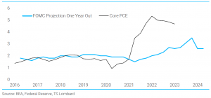 Nie da się ukryć, że rynki finansowe ucieszyłyby się z końca cyklu. Optymistycznie zareagowałyby na zapowiedź obniżek. Wciąż wydaje się, że „rynek” nie do końca uwierzył Powellowi i jego jastrzębiej masce. Trzeba powiedzieć, że są ku temu podstawy. Podobnie jak większość ekonomistów Rezerwa Federalna Stanów Zjednoczonych i jej dział analiz nie potrafi trafnie przewidzieć trajektorii inflacji. Na wykresie widać prognozy inflacji na „za rok” i jej realne odczyty. Wyraźnie widać opóźnienie a może jest to bardziej dopasowywanie prognoz od obecnej sytuacji. Idąc tym tropem może inflacja zaskoczy wszystkich spadając.