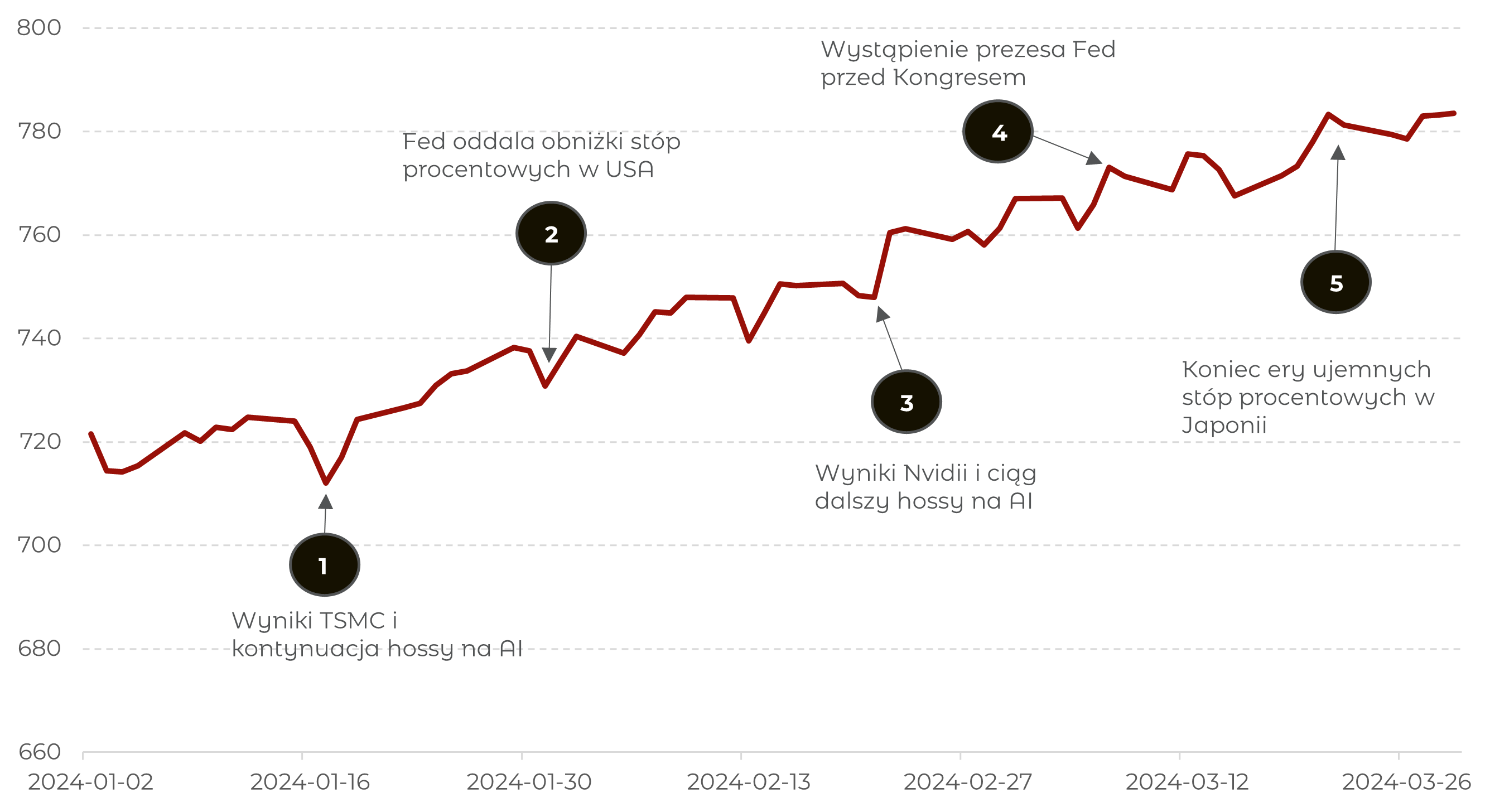 - Po wynikach i prognozach na 2024 tajwańskiej spółki TSMC, siła spółek postrzeganych jako beneficjenci AI znów powróciła, ciągnąc za sobą tym razem również szerszy rynek.