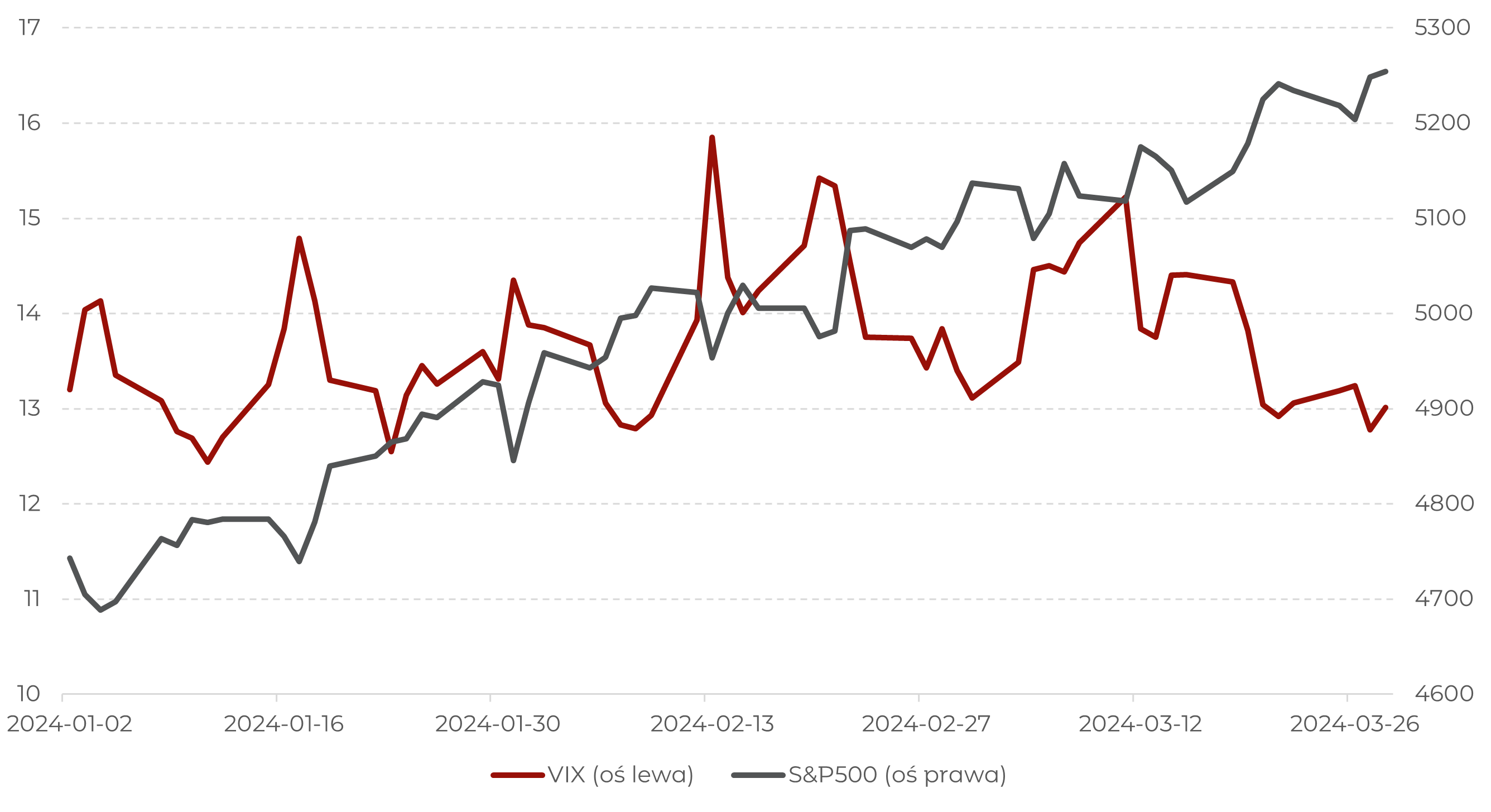 Wykres 2. Notowania amerykańskich akcji (indeks S&P500) i zmienność (indeks VIX) w I kwartale 2024 roku.