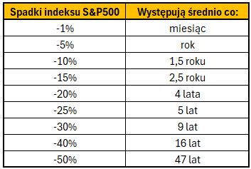 Przejściowa zmienność, spadki wartości inwestycji i przede wszystkim nerwy z tym związane to jednak cena, którą musimy zapłacić za długoterminowe, wyższe stopy zwrotu, o czym pisaliśmy tutaj. Warto pamiętać również o prostej giełdowej statystyce, która uświadamia, że przejściowe spadki na rynku akcji to coś zupełnie normalnego i coś, co musimy zaakceptować. Zgodnie z tabelą poniżej korekta o 5% zdarza się średnio raz na rok, a spadek rzędu 20% raz na 4 lata. Pomimo tych (jak również głębszych) spadków rynek akcji w długim okresie rósł średniorocznie o ok. 8%.