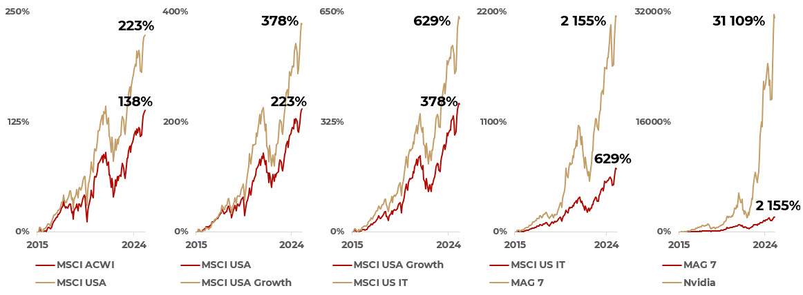 No tak, ale po co była tak szeroka, światowa dywersyfikacja, skoro można było wszystko zainwestować tylko w Stanach? W 10 lat MSCI USA zyskał 223% (ok. 12,5% średniorocznie)! Ale owe „Stany” to też niejednolity rynek. Ostatnie lata należały do tzw. spółek wzrostowych, które zyskały 378% (ok. 17% średniorocznie), a sam sektor IT aż 629% (22% średniorocznie). Tylko co z tego skoro ci sprytniejsi z pewnością od razu postawili na zwycięzców aktualnej hossy, czyli tzw. magnificent 7[1], (zysk 2155%, średniorocznie ok. 36%). Choć i oni prawdopodobnie plują sobie w brodę, że dobrali te niepotrzebne 6 spółek, skoro mogli kupić tylko Nvidię (31109%, czyli ok. 78% średniorocznie).
