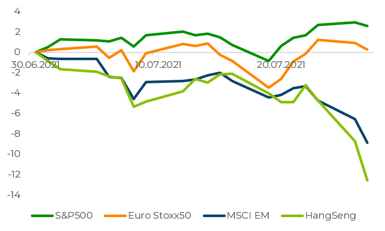Jak widać światowemu indeksowi najbardziej ciążyły rynki wschodzące, które z kolei zostały uderzone przez to, co w ostatnich dniach działo się w Chinach. Otóż rząd chiński zdecydował się przeprowadzić szereg inicjatyw, które uderzyły w sektory takie jak edukacja, technologie, czy nieruchomości. W ekstremalnym przypadku okazało się, że de facto zakazano firmom działającym w sektorze edukacyjnym… zarabiania pieniędzy (więcej można przeczytać w artykule w serwisie Bloomberg tutaj). Ale przykładów było więcej. Wszystko to oznacza, że szerokie rynki wschodzące najprawdopodobniej po dzisiejszym dniu pokażą ujemny wynik za cały 2021 rok, co znacząco kontrastuje z rynkami rozwiniętymi.