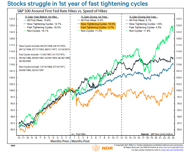 Ostatnie dni dla giełd to formacja tzw. piły (ˆˇˆˇˆˇˆˇˆˇˆˇ), czyli przeplatanie plusów z minusami. Zaczęło się wszystko w piątek, kiedy informacje o omikronie trafiły na otoczenie niezwykle niskiej płynności (dzień po Święcie Dziękczynienia) i mieliśmy swego rodzaju flash crash (pisaliśmy o nich tutaj). Dlatego spróbujmy spojrzeć nieco dalej w przyszłość. Załóżmy, że program luzowania ilościowego zakończy się wiosną i kilka miesięcy później Fed zacznie podwyższać stopy procentowe. Co wtedy z giełdą? Historia pokazuje, że zależeć to będzie od tempa tych podwyżek. Zerknijmy na wykres przygotowany przez niezależną firmę NDR: